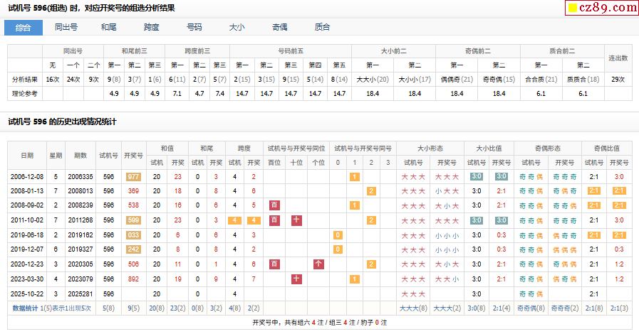 > 281期福彩3D试机号596对应开奖号的组选分析结果